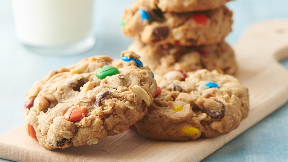 Packed with peanut butter, oats, chocolate chips, and candy-coated goodness, these easy cookies are a colorful, chewy classic that the whole family will love. Perfect for stocking your cookie jar in a flash.
